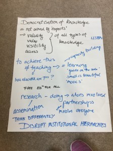 The photos below provide a synthesis of the discussion on knowledge democracy. The ICPHR members in Ireland were enthusiastic about the process of thinking about the questions set. They thought they had a good amount of ambiguity to enable meaningful discussion. There were particular comments about the notion of advancing knowledge and the use of the term ‘democracy’.