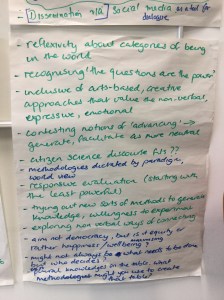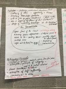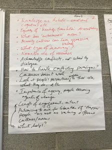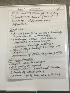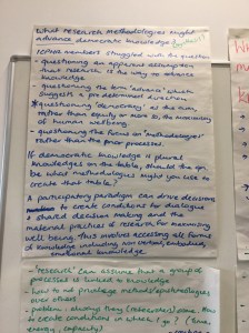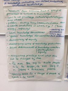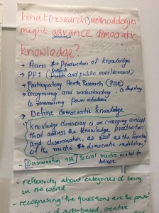 The photos below provide a synthesis of the discussion on knowledge democracy. The ICPHR members in Ireland were enthusiastic about the process of thinking about the questions set. They thought they had a good amount of ambiguity to enable meaningful discussion. There were particular comments about the notion of advancing knowledge and the use of the term ‘democracy’.